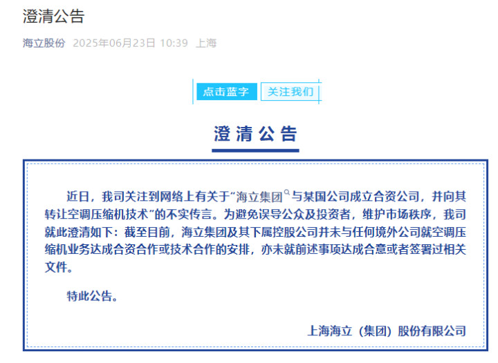 海立股份表示,为避免误导公众及投资者,维护市场秩序,就此澄清如下:截至目前,海立集团及其下属控股公司并未与任何境外公司就空调压缩机业务达成合资合作或技术合作的安排,亦未就前述事项达成合意或者签署过相关文件。